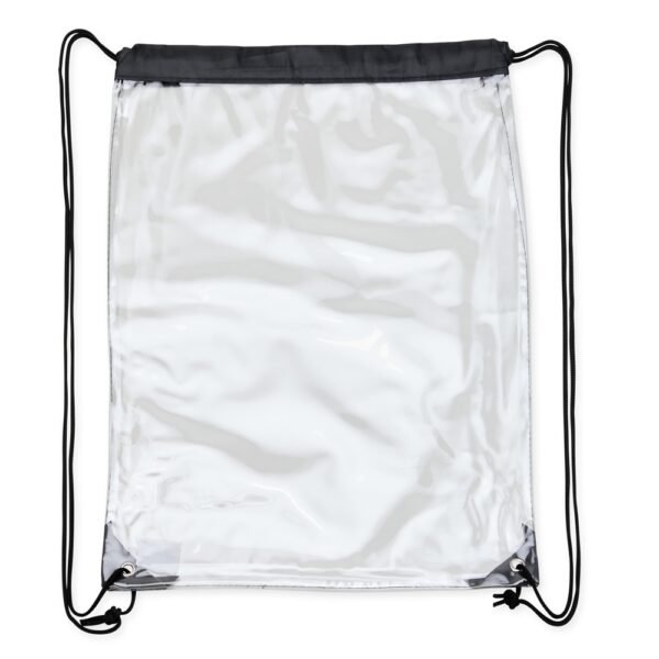 Descrição: Mochila Saco em PVC transparente com detalhes em tecido nylon, alças reguláveis e dois ilhós metálicos.