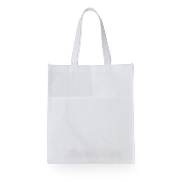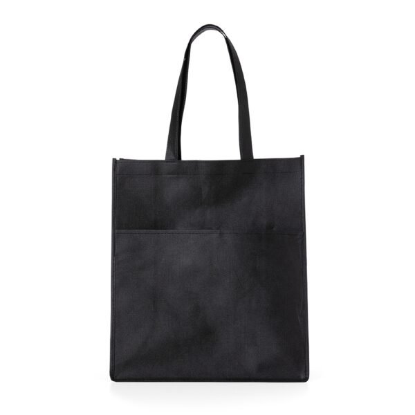 Descrição: Sacola ecológica com bolso frontal externo e fundo amplo, contém alças para transporte.