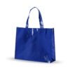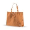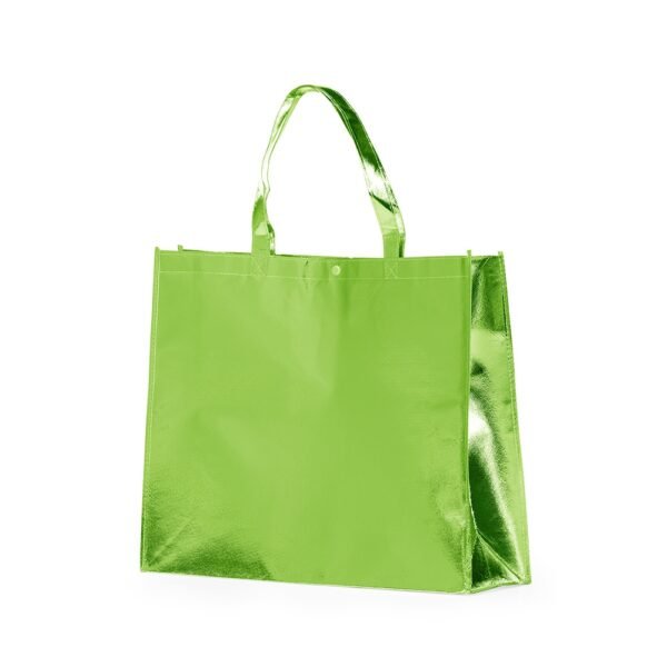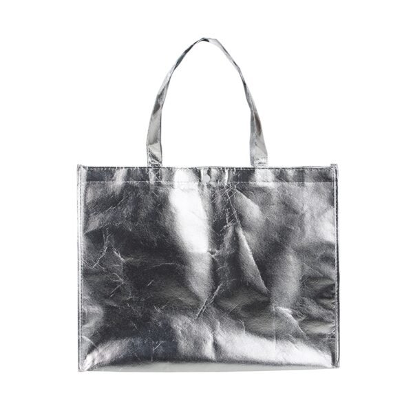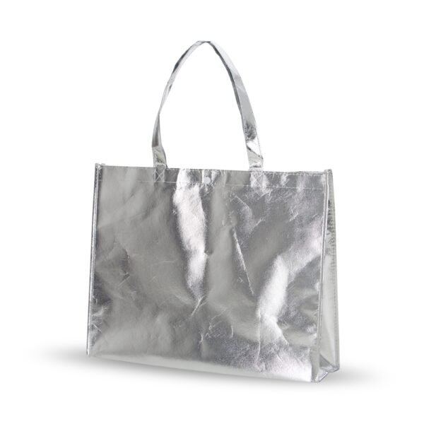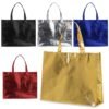 Descrição: Sacola TNT metalizada com botão. Confeccionado em TNT com revestimento plástico laminado, parte superior possui botão plástico para fecho.